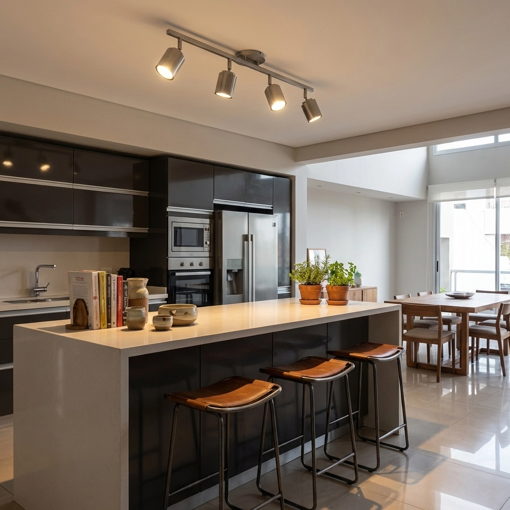 Plafón de metal negro con diseño moderno y acentos en cromo. Ideal para iluminar cocina, baño, living, pasillo u oficina con focos GU10.