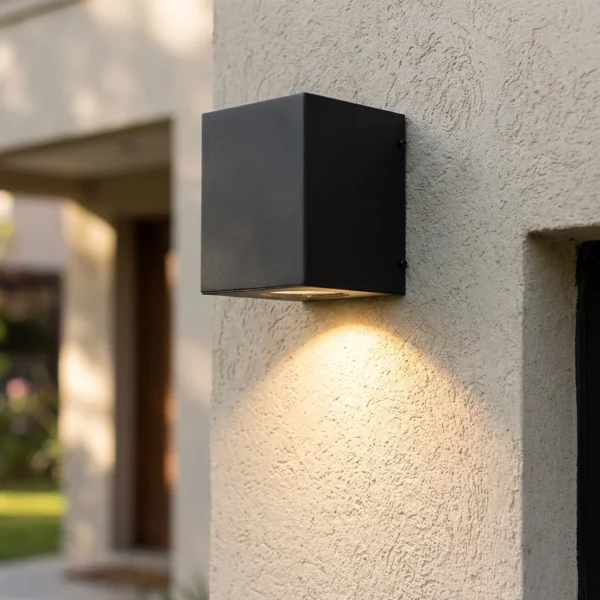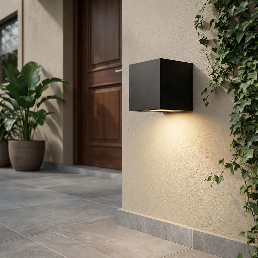 La fachada es la primera impresión. El Aplique Ext. Levanto cambia lo que ven todos antes de entrar. Aluminio de fundición, acabado Negro mate y óptica precisa — diseñado para resistir y destacar a la vez.